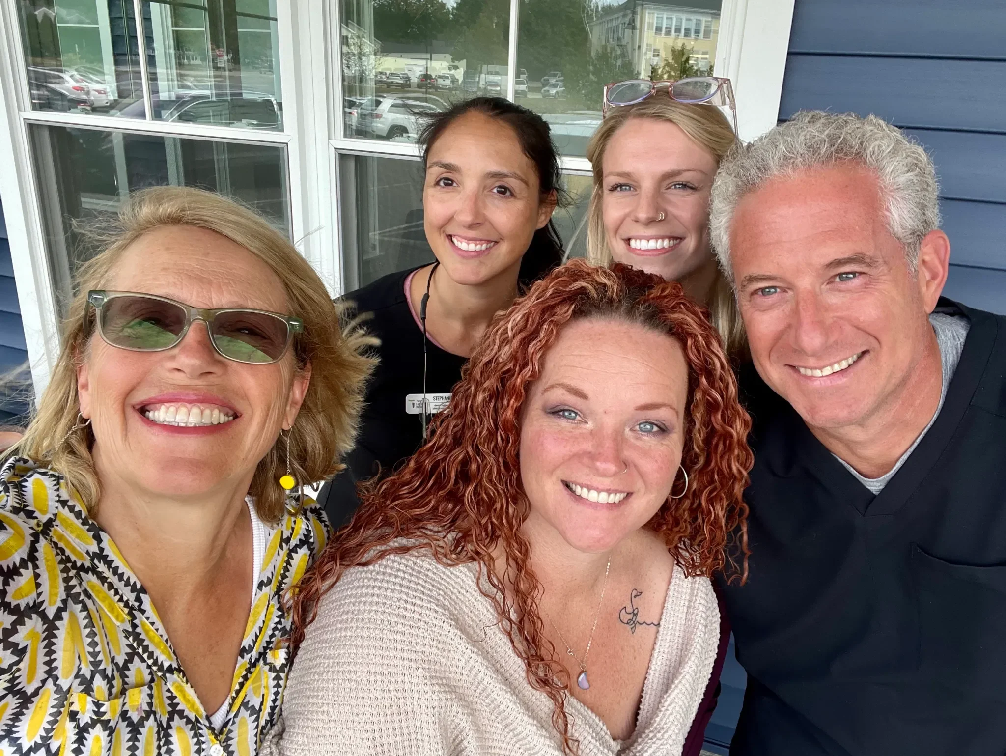 Monique Tash, in white sweater, with her newly restored smile courtesy of Dr. David Jacobson (right) and the Two Lights Dental team (back row). Patrisha McLean (left) is the CEO and founder of Finding Our Voices, which runs the Finding Our Smiles donated-dental program. (Courtesy of Patrisha McLean)
