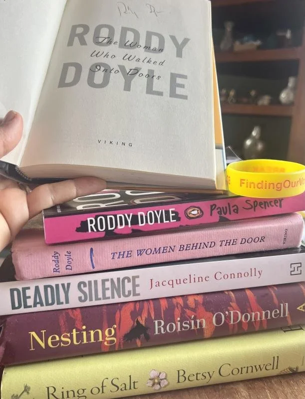 The autographed and first-edition copy of Roddy Doyle's The Woman Who Walked Into Doors that tops this stack was a gift to the nonprofit's CEO+Founder Patrisha McLean from her son Wyatt. The Irish authors of all of these books will be joining talks with Finding Our Voices through March. (Photo by Patrisha McLean)