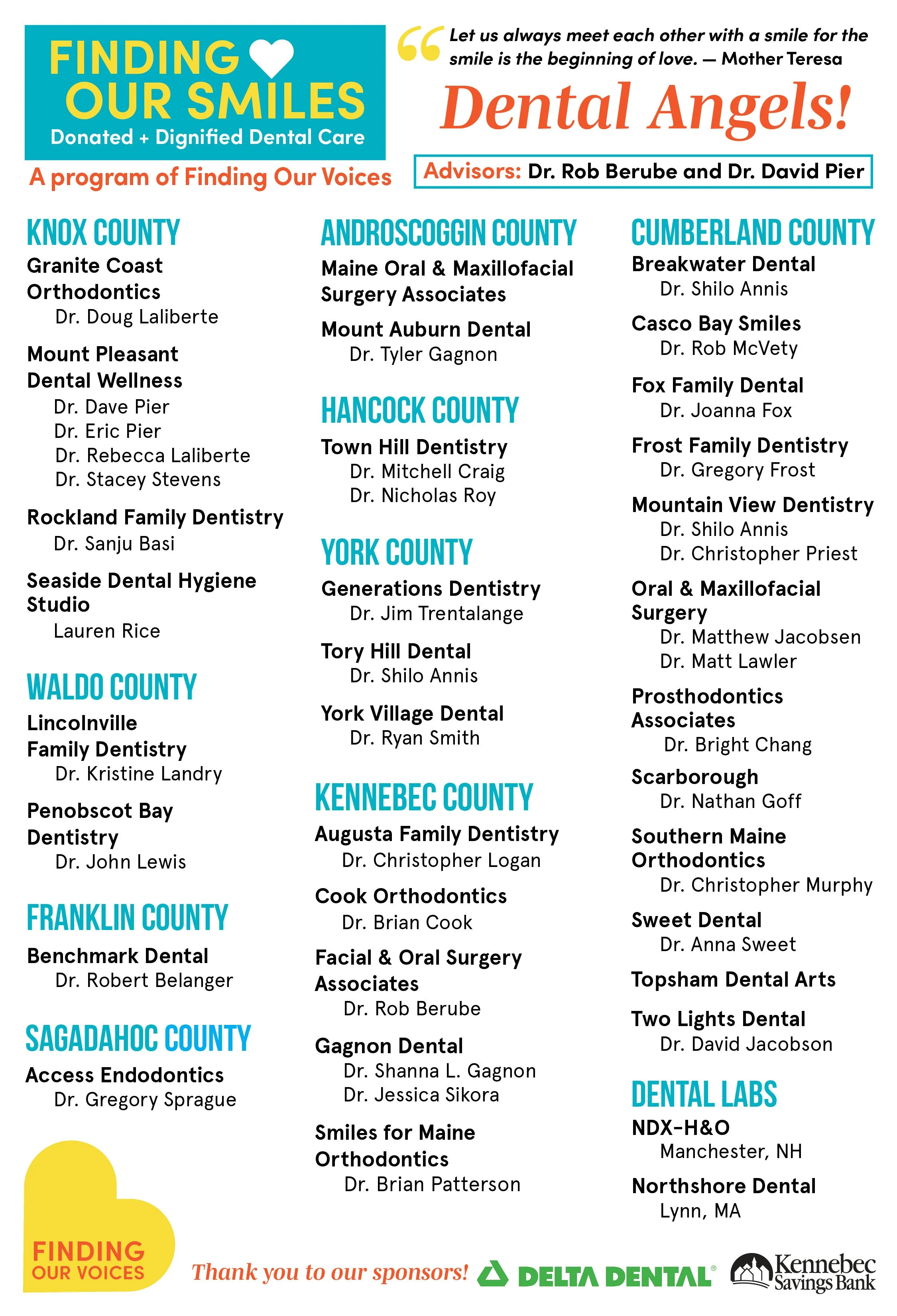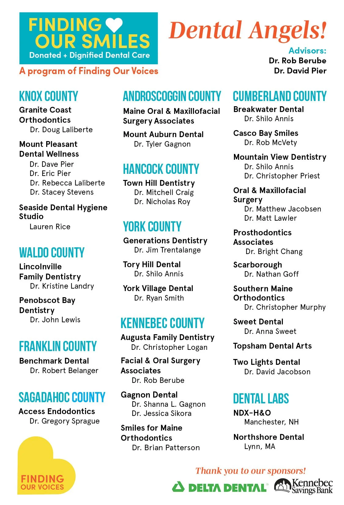 Finding Our Voices receives no government funding and looks to individual and corporate donations as well as grants to fund Finding Our Smiles expenses which are primarily administrative time, according to McLean. Finding Our Smiles sponsors are Northeast Delta Dental Foundation, which provided a 2025 grant of $7,500.00, and Kennebec Savings, which provided a 2025 grant of $5,000.00.