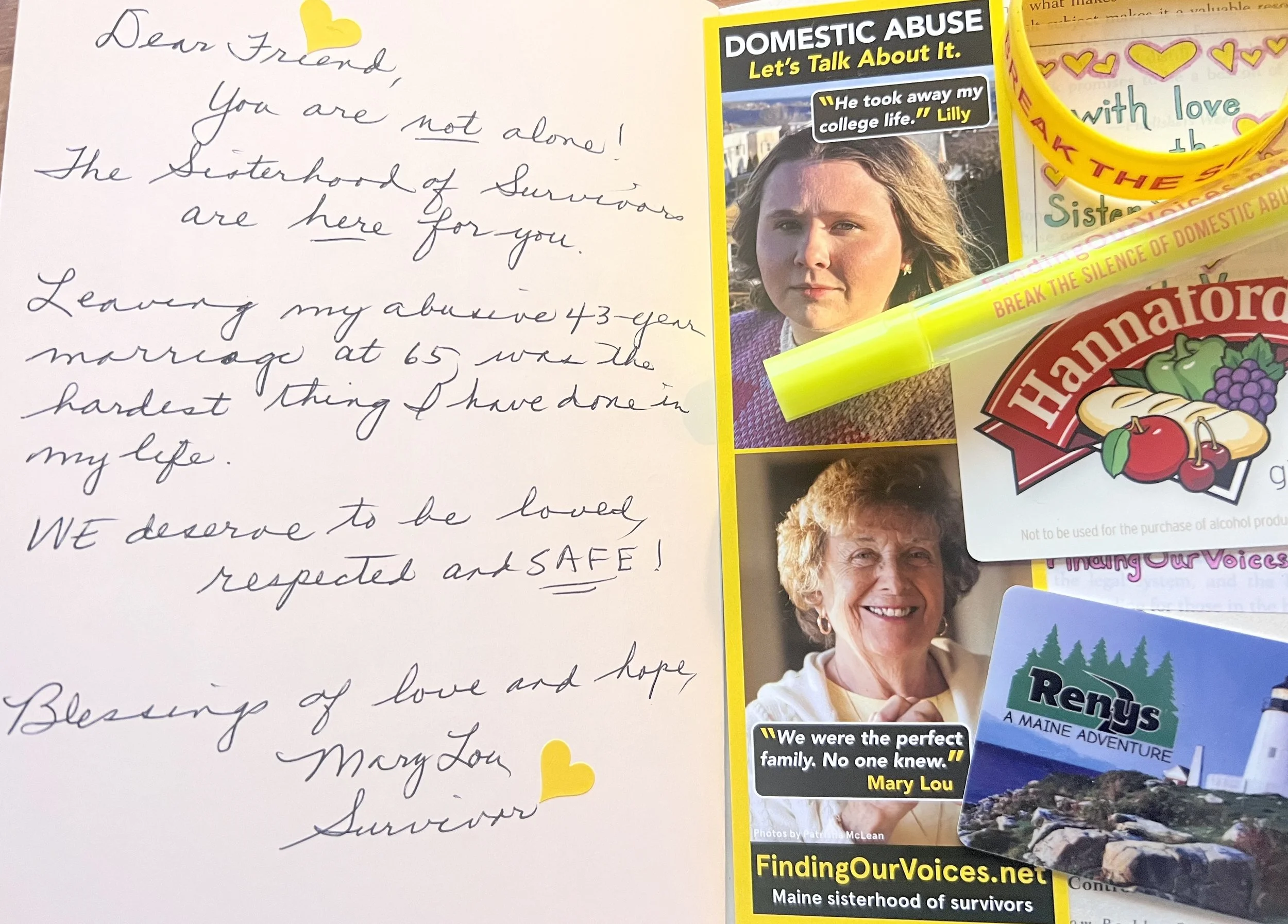 We mail out gift packets every day to our survivor sisters across Maine that include personally-inscribed books that were helpful during our journeys, yellow writing journals, and our yellow power-bracelet.