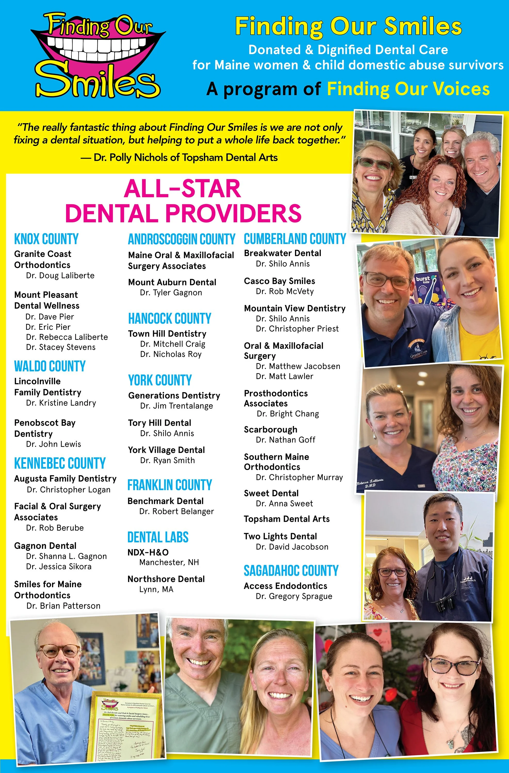 Dentists are inveterate fixers, we like to make a bad situation better. And the really fantastic thing about "Finding Our Smiles" is we are not only fixing a dental situation, but helping to put a whole life back together. — Dr. Polly Nichols of Topsham Dental Arts